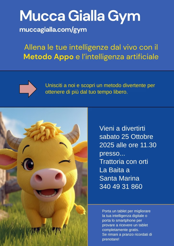 Non lasciare che questa occasione ti sfugga. Che tu sia un appassionato di tecnologia, un curioso del Metodo Appo o semplicemente alla ricerca di un modo nuovo e stimolante per impiegare il tuo sabato, Mucca Gialla Gym è l’evento che fa per te.
